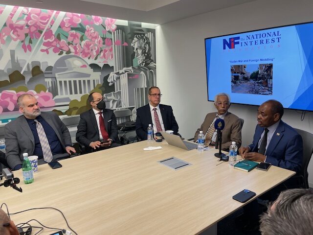 Last Thursday, November 6th, the National Interest Foundation (NIF) hosted an event titled “Sudan War and Foreign Meddling” regarding the latest developments surrounding the war in Sudan and the foreign meddling in the conflict. The distinguished event speakers were H.E. Mohamed Abdalla Idris, the Ambassador of Sudan to the United States and H.E. Dr. Khidir Haroun Ahmed, the former Ambassador of Sudan to the United States who is currently Associate Professor of Political Science at the International University of Africa. The discussion was moderated by Khaled Saffuri, President of NIF.