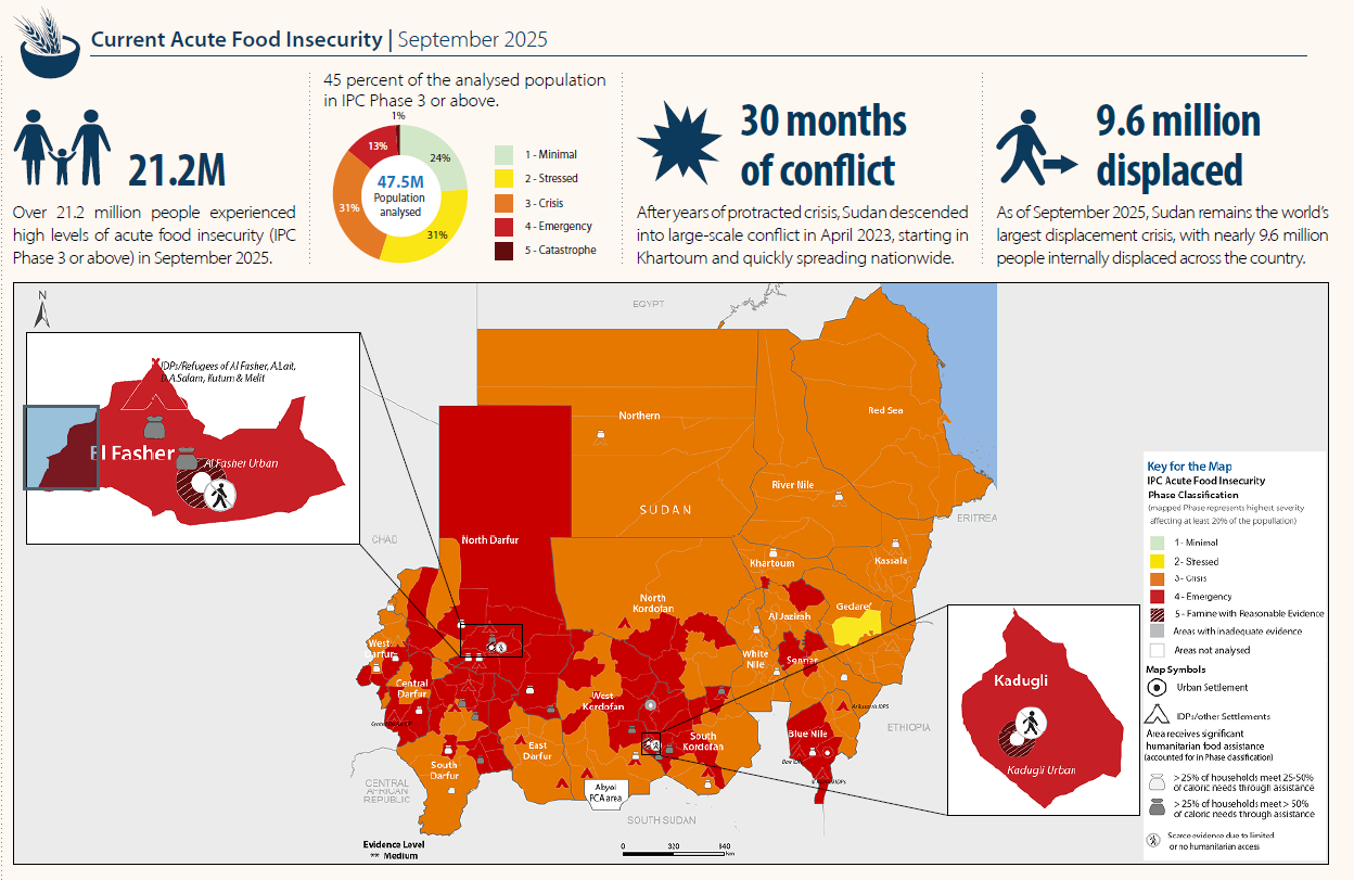A recent report released by the Integrated Food Security Phase Classification Partnership (IPC) – a snapshot of which is below – documented that famine is persisting in Sudan and that it remains the world’s largest hunger and displacement crisis, with over 21 million people in urgent need of humanitarian assistance and nearly 10 million displaced internally. A significant portion of the internal displacement is concentrated in the region of Darfur, with North Darfur in particular experiencing a sharp increase in internally displaced people this year. Starvation is also especially severe in locations where the RSF has obstructed civilian movement and humanitarian access, with the recent atrocities in and around El Fasher in North Darfur highlighting the severity of the human rights violations and war crimes being committed. The United Nations estimates that at least 2,500 civilians have been executed in El Fasher since the RSF takeover there on October 26th, but experts contend that the total number is likely much higher given the current inability to assess the full scale of the violence there. Furthermore, it is believed that 82,000 civilians or more of the city’s total population were forced to flee, with many others still trapped. In addition to El Fasher, several other areas – including Kadugli and Dilling in South Kordofan – are also of critical concern as they continue to face sieges and alarming levels of violence.