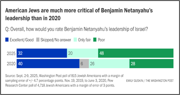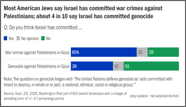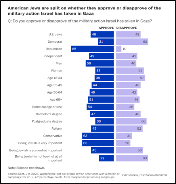 A recent poll conducted by The Washington Post has found that many American Jews are strongly critical of Israel’s actions in Gaza. The survey – which was taken in early September and published this week as the Gaza War surpassed its two-year mark – sheds light on several notable areas of denunciation regarding Israel’s military conduct, its government, and its policies. The poll is merely the latest one demonstrating the evident trend of growing disapproval toward Israel, something that has manifested both domestically and internationally across a wide array of demographic groups. Thus, The Washington Post’s findings on the subject are part of a broader shift in public opinion that has been well documented by multiple reputable research institutions, pollsters, human rights organizations, and others.