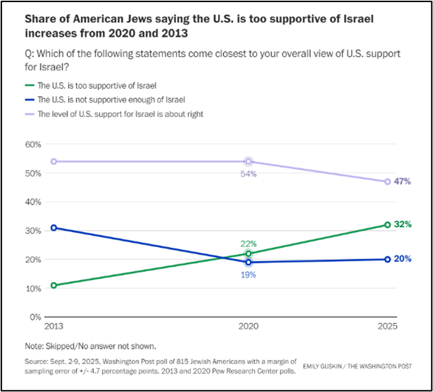 The poll also revealed a substantial increase in American Jews who believe that the United States is too supportive of Israel. Compared to only 5 years ago in 2020, this percentage has jumped 10 percentage points – from 22% to 32%. Furthermore, when looking back a bit further to data from 2013, it is clear that this figure has continued to significantly climb over the past 12 years – from just above 10% to 22% and now to 32%. During this same time period, the proportion of American Jews who contend that the United States is not supportive enough of Israel has dropped by more than 10 percentage points as well and now sits at only 20%. Additionally, the fact that there has also been a dip in those who feel that the level of U.S. support for Israel is about right – from 54% in 2020 to 47% in 2025 – which comes in conjunction with the rise in the sentiment that the United States is too supportive of Israel, further crystalizes the evident growing belief that the level of American support for Israel is not appropriate overall.