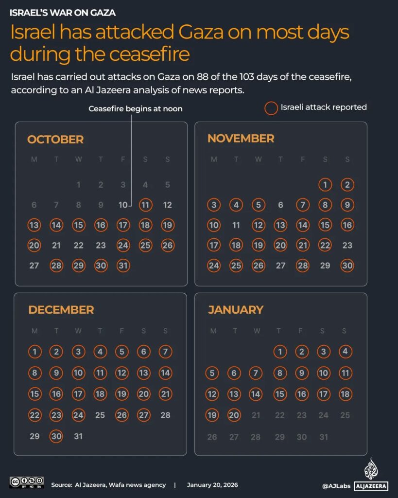 An in-depth look at Israel’s military attacks over the course of the full calendar of days since the beginning of the ceasefire shows just how recurrent the almost daily violations have been. In the 103 days between October 10th, 2025 (the day that the ceasefire went into effect) and earlier this week on January 20th, 2026, Israel was found to have carried out attacks in Gaza on an appalling 88 of these days. Thus, the evidence highlights that only an alarming 15 days during this close to three-and-a-half-month period have been free from violent attacks, killings, injuries, and continued displacement of civilians. Despite the repeated attacks, the United States maintains that the ceasefire is holding – even as belligerent Israeli military activity persists on the ground. As such, the Trump administration has faced significant levels of criticism for its failure to hold Israel accountable for the aforementioned at least 1,250 Israeli violations of the ceasefire since October. Observers have outlined how the administration’s “blind spot” regarding continued Israeli military attacks and clear evidence of noncompliance is undermining the very peace plan that it brokered. Rights groups contend that the refusal to pressure Israel has led to a catastrophic shortfall in aid, with the levels of this failing to even reach 50% of what was stipulated as a part of the ceasefire agreement. Furthermore, the Trump administration has been criticized for going so far as to publicly defend destructive and controversial Israeli actions – such as its targeted assassinations of Hamas officials after the implementation of the Gaza ceasefire agreement. Instead, as has been pointed out, Trump officials should be denouncing these and other violations as blatant breaches of the truce that risk a return to full-scale conflict.